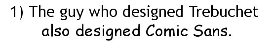 Yes, the impeccably credible Trebuchet and the much-mocked Comic Sans were both designed by Microsoft typographic engineer Vincent Connare. Connare seems to have a sense of humor about being known as “the Comic Sans guy”, but insists that his most notorious creation has its uses, if not necessarily on ambulances and tombstones. “If you love Comic Sans, you don’t know much about typography,” he tells Garfield. “If you hate it, you really don’t know much about typography, either, and you should get another hobby.” But what does it mean if we love Trebuchet?…