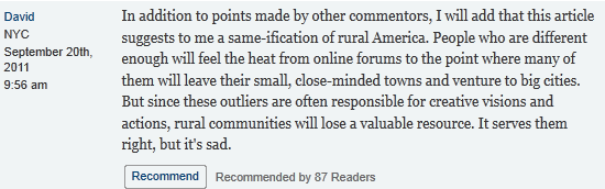 While it is well-worded and more insightful than the above posts, I can’t help but feel it is just as condescending. Coming from a small town three hours north of the city, I’m not that excited to hear New Yorkers analyze small town dynamics. In fact, my town, Pine Plains, was featured as a weekend haven in a condescending Times article of its own in 2003. One line sticks out in particular: when discussing the local wine and spirits shop, the author writes, ”…it was hard to distinguish weekenders from the full-time residents with people bundled in uniform layers of turtlenecks, flannel shirts and down jackets.” Because get us out of those turtlenecks and we’ll look like a different species or something, right?