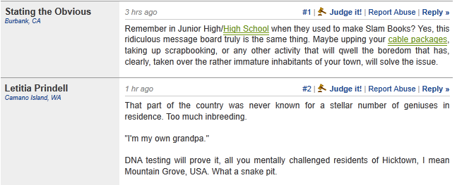 The New York Times recently published an article about a site called Topix that was “initially envisioned as a hyperlocal news aggregator with separate pages for every community in the country.” Now, though, its main purpose seems to be for anonymous users to perpetuate gossip. On the Mountain Grove, MO board, for example, tempers run very high, causing residents to get divorces, consider suicide, or leave town altogether. I only had to click on the first post I saw to find this juicy tidbit…